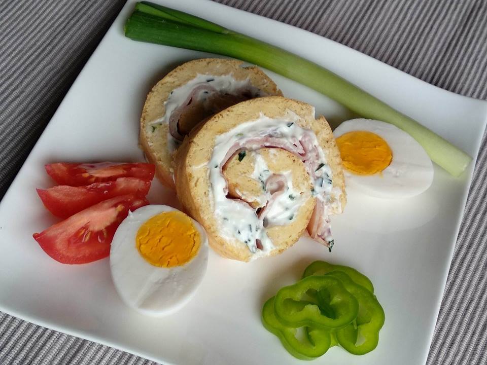 Amíg hűl a tészta, készítsd el a tölteléket. A totu krémet, totukrém extrát, citromlét, sót, ízlés szerint zöld fűszereket, a feloldott zselatint keverd össze. A kihűlt tésztát kend meg a krémmel, szórd meg az apróra vágott hagymával, lila hagymával. Fektesd rá a sonka szeleteket, majd szorosan tekerd fel. Pár órára, tedd hűtőbe.