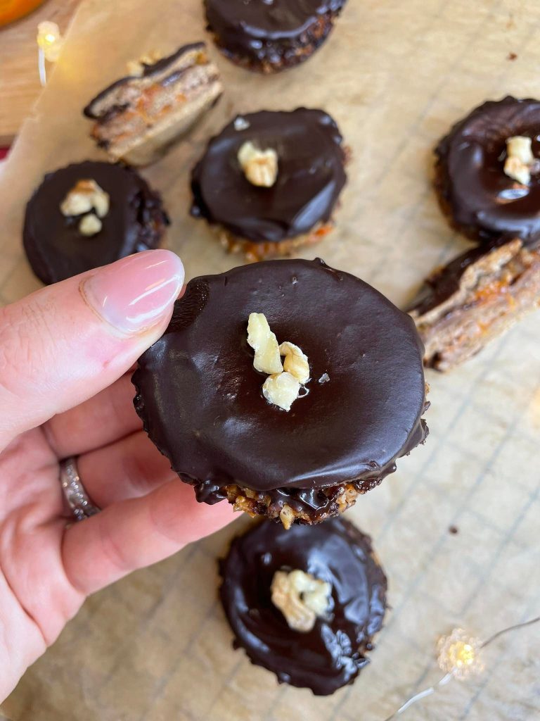 Elkészítés: A lisztet a fahéjjal össze dolgozzuk, majd a margarin és az édesítőszer hozzáadásával össze gyúrjuk a tésztát. Ezt fogjuk kinyújtani pici pihentetés után, és egy kiszúró segítségével 24 db korongot formázunk belőle (ha tepsiben készítjük akkor 3 részre osztva nyújtsuk ki a tésztát). Olajjal kikent muffin formába helyezzük az első tészta réteget, jöhet rá egy teáskanál lekvár és egy szórás eritrites-dió keverék. Erre jön egy újabb tészta réteg, amire mehet újra a lekvár, majd itt csempésszük bele a mangó pürét ha szeretnénk, jön egy újabb diós réteg, majd egy utolsó tészta réteggel zárjuk az egészet. 190 fokos sütőben alsó-felső sütéssel 30 perc alatt készre sütjük.